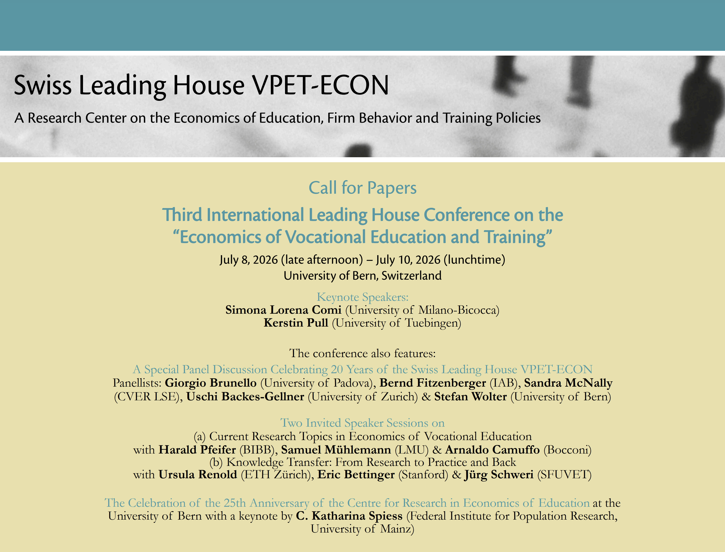 The Call for Papers for the Third International Leading House Conference on the “Economics of Vocational Education and Training”, taking place 8 – 10 July 2026 in Bern, is now open!
